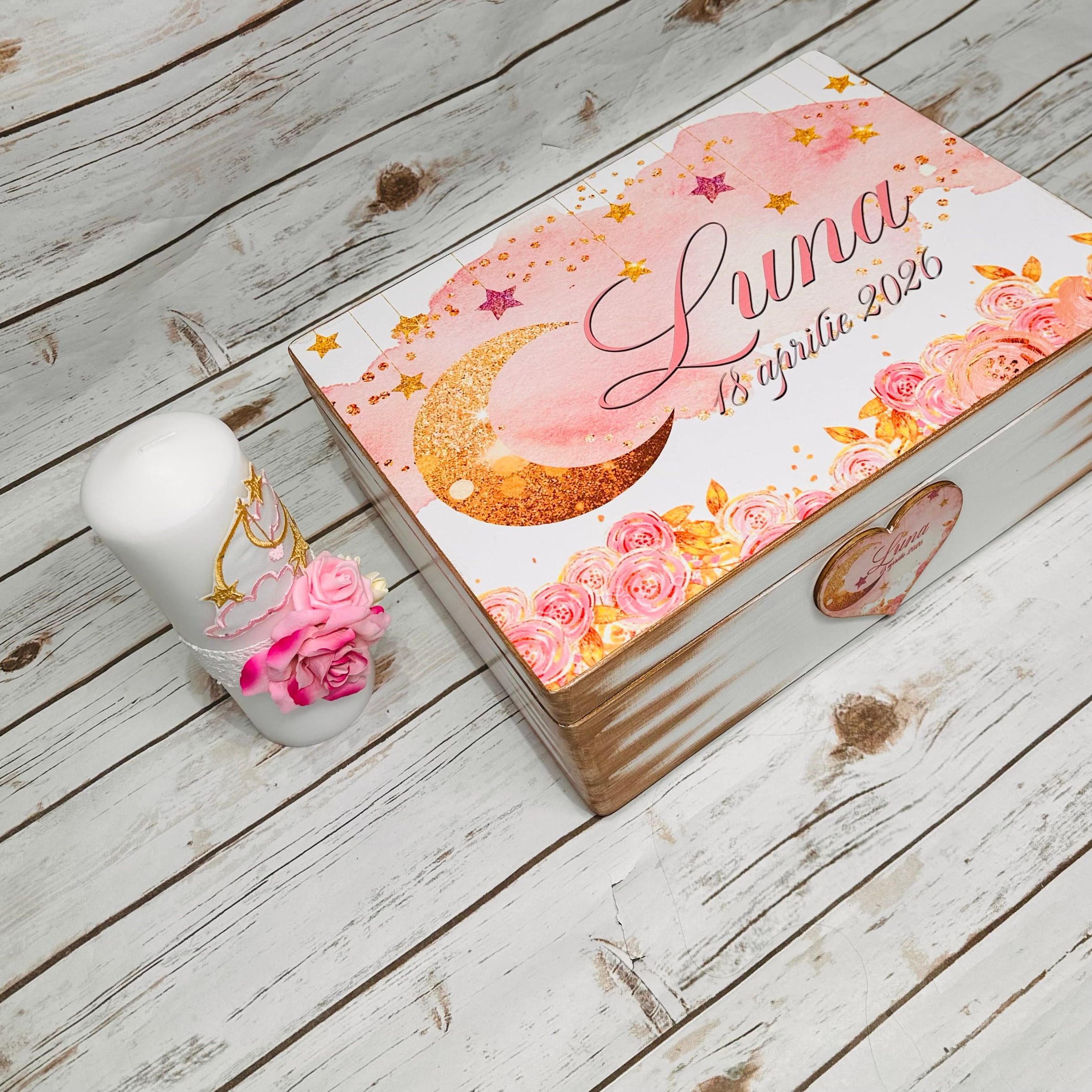 - Cutie din lemn personalizată tematic cu nume, dată și mesaj la alegere. Dimensiuni: 40x30x15 cm.