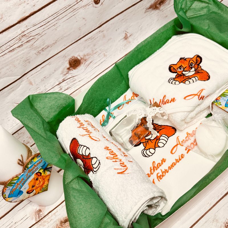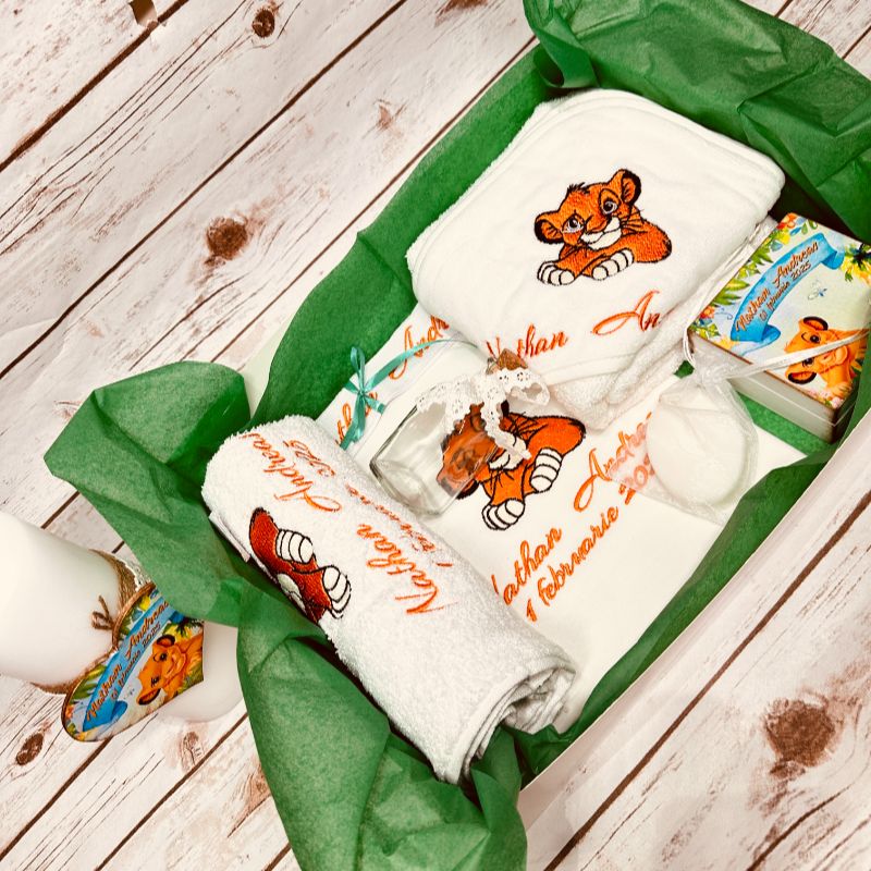 - Prosop cu capișon personalizat: Brodat cu un design simplu și elegant, împreună cu numele copilului. Dimensiune: 80×80 cm.