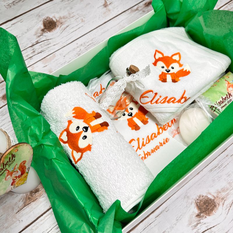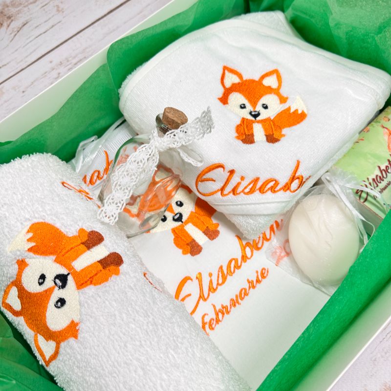 - Prosop cu capișon personalizat: Brodat cu un design simplu și elegant, împreună cu numele copilului. Dimensiune: 80×80 cm.